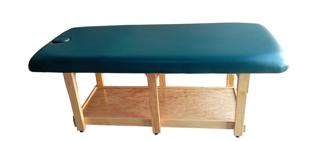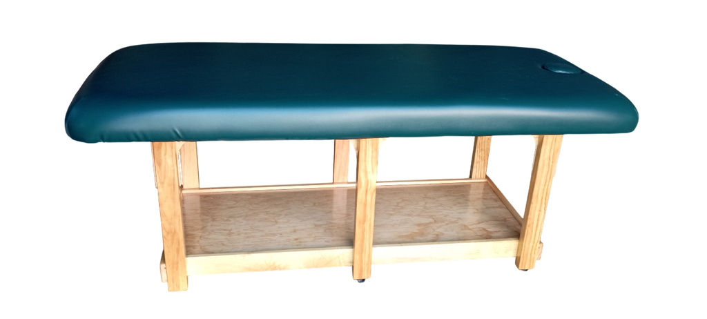la cama de masaje fija está diseñada para espacios profesionales estables y fijos, tiene esquinas redondeadas y cuenta con estante entre patas, en fabricación estándar, útil para acomodar los blancos y utensilios más usados.